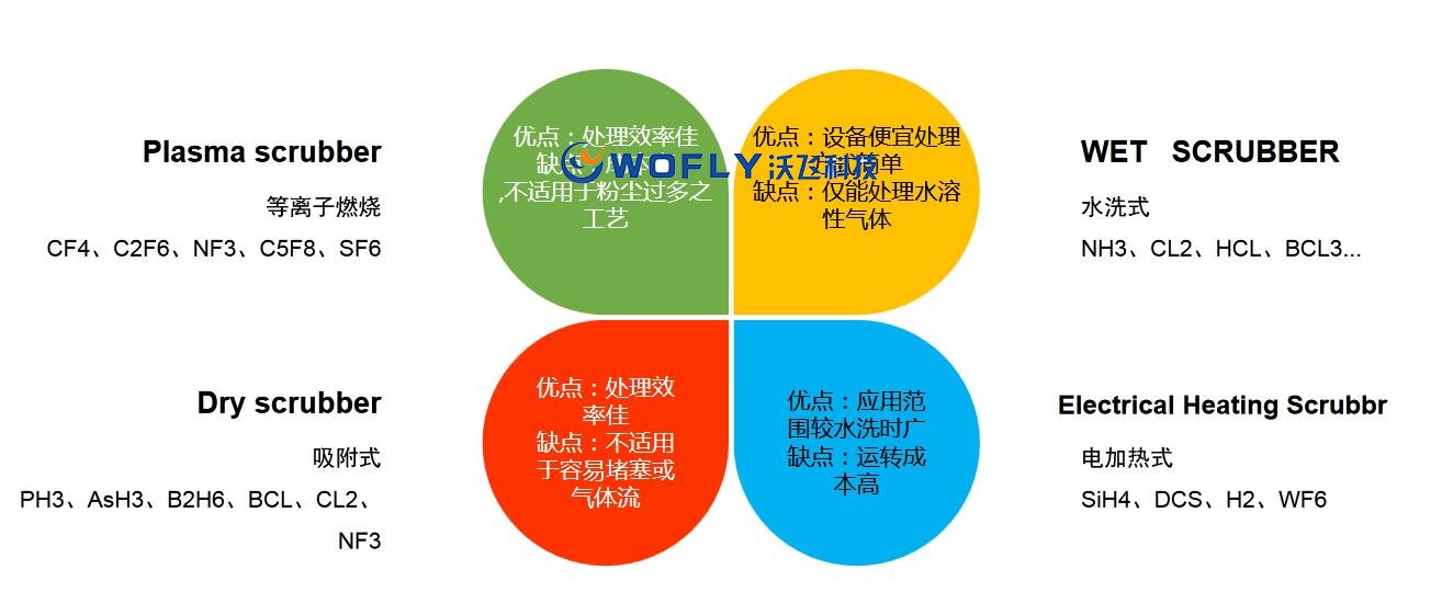 由于以上四种气体对环境或人体皆具有一定的危害性,必须防止其直接排放大气中,所以,一般半导体厂都以加装大型中央废气处理系统.但此系统仅以水洗涤废气.故其应用范围仅限于处理水溶性气体,无法因应日新月异且分工细微的半导体工艺废气.因此必须依据各工艺所衍生出的气体特性种类,选择搭配相对应的废气处理设备,才能有效解决废气问题.而由于工作区域多半离中央废气处理系统前,常因气体特性导致管路中结晶或粉尘堆积,造成管路堵塞后导致气体泄漏,严重者甚至引起爆炸,无法确保现场工作人员之工作安全.因此在工作区域需配置适合工艺气体特性的小型废气处理设备(Local Scrubber),以减少在工作区域滞留的废气,确保人员安全。
