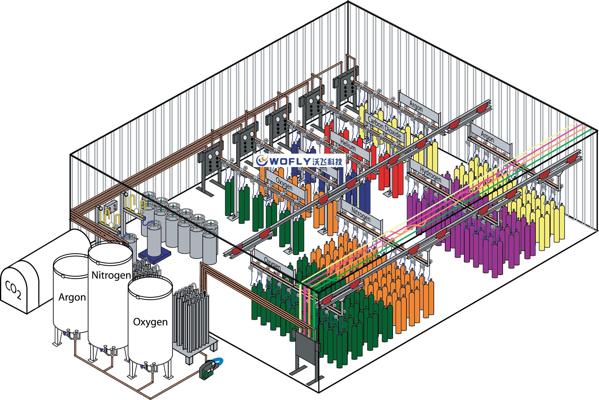气体充装系统详细讲解。工业气体按组份可分为单一品种气体的工业纯气和二元或多元气体的工业混合气。国家标准《瓶装压缩气体分类》(GB16163-1996)中,根据工业纯气在气瓶内的物理状态和临界温度进行分类,并按其化学性能,燃烧性、毒性、腐蚀性进行分组。第1类为永久气体,其临界温度〈-10℃,在充装时以及在允许的工作温度下储运和使用过程中均为气态,分为a、b两组:a组为不燃无毒和不燃有毒气体(包括氧、 氮、氩等),b组为可燃无毒和可燃有毒气体(包括氢等)。第2 类为液化气体,其临界温度≥-10℃, 包括高压液化气体和低压液化气体。其中,高压液化气体临界温度≥-10℃、且≤70℃,在充装时为液态,但在允许的工作温度下储运和使用过程中随着温度升高至临界温度时即蒸发为气态,分为a、b、c 三组:a组为不燃无毒和不燃有毒气体(包括二氧化碳);b组为可燃无毒和自燃有毒气体;c 组为易分解或聚合的可燃气体。低压液化气体临界温度〉70℃,在充装时以及在允许的工作温度下储运和使用过程中均为液态,也分为a、b、c三组:a组为不燃无毒和不燃有毒及酸性腐蚀气体(包括氯);b 组为可燃无毒和可燃有毒及碱性腐蚀气体(包括氨);  c 组为易分解或聚合的可燃气体。第3类为溶解乙炔, 在压力下溶解于气瓶内溶剂的气体,仅有a组:易分解或聚合的可燃气体(包括乙炔)。此分类是混合气配制的基础。