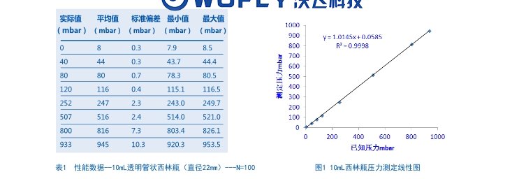 采用填充氮气压力为0、40、80、120、253、507、800和933 mbar的一组压力标 准评估用于测定总顶空压力的系统性能。通过直径为22mm的10mL西林瓶建立这些标 准。使用FMS-1400顶空水汽/真空度测试仪测定每种标准100次。FMS-1400顶空水汽/真 空度测试仪测定容器顶空中水蒸气分子的激光吸收量。吸收信号宽度与氮气压力相关。根 据测得数据确定平均浓度、标准偏差、最大读数和最小读数,这些数据如表1所示。图1所示 为表1中压力数据的线性图。