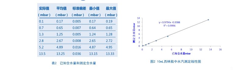 使用填充水蒸汽压力为0.1、0.7、1.3、2.8、5.2、13.5mbar的一组水汽标准物质评估用于测定水蒸气压力的系统性能。通过直径为 22mm的10mL西林瓶建立这些标准。使用FMS-1400水汽/真空度测试仪测量每种标准物质100次。FMS-1400水汽/真空度测试仪测量容器顶空中水蒸汽分子激光吸收量。吸收信号振幅与顶空水汽汽浓度成比例。根据测得的数据集确定平均浓度、标准偏差、最大读数和最小读数,这些数据如表2所示。图2所示为表2中水分浓度数据线性图。这种测定的无损特性使得我们可以建立系统性能的全面统计文档。从应用的观点来看,采用无损测量可以在同一个样品上随着时间进行多次测定(例如在整个货架期内进行多次测定),并且进行全面的批量分析可帮助客户深入了解工艺的变化和对应的优化措施。