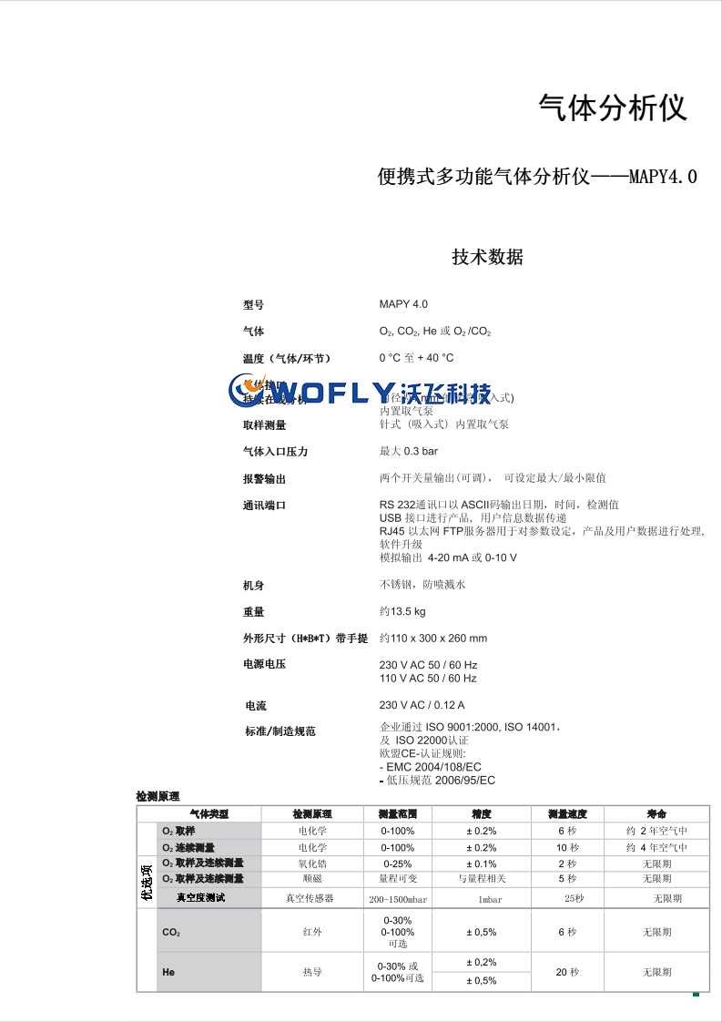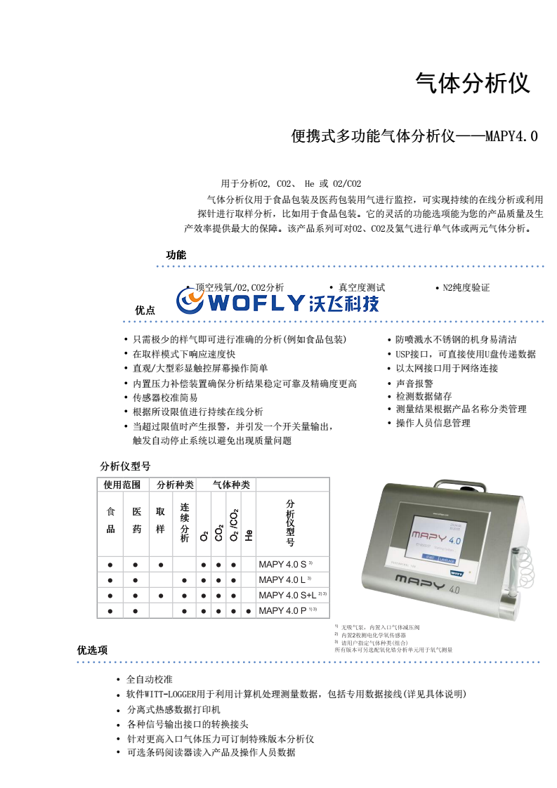 全自动校准软件WITT-LOGGER用于利用计算机处理测量数据,包括专用数据接线(详见具体说明)分离式热感数据打印机各种信号输出接口的转换接头针对更高入口气体压力可订制特殊版本分析仪便携式多功能气体分析仪——MAPY4.0