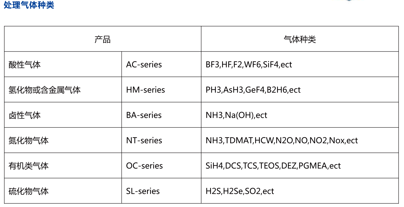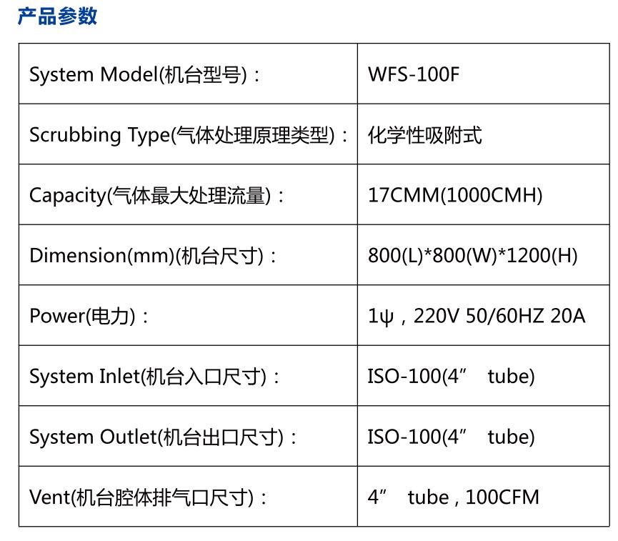 WFS-100F吸附式local scrubber 尾气处理设备可处理气体种类包括半导体、液晶以及太阳能等行业中蚀刻制程与化学气相沉积制程中使用的特气,主要包括SiH4、SiH2Cl2、PH3、B2H6、TEOS、H2、CO、NF3、SF6、C2F6、WF6、NH3、N2O等。