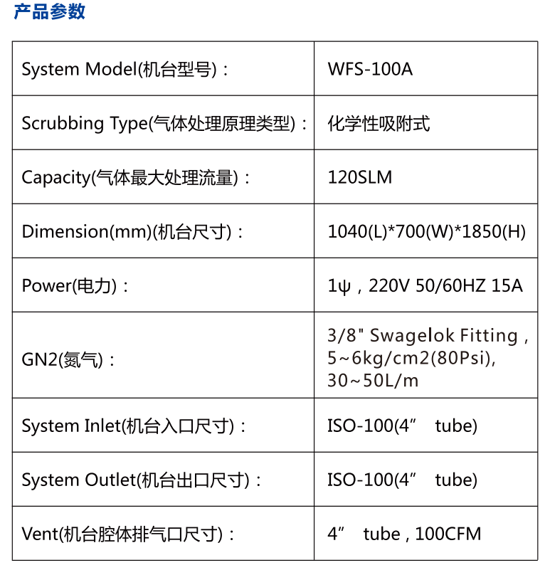 WFS-100F吸附式local scrubber 尾气处理设备可处理气体种类包括半导体、液晶以及太阳能等行业中蚀刻制程与化学气相沉积制程中使用的特气,主要包括SiH4、SiH2Cl2、PH3、B2H6、TEOS、H2、CO、NF3、SF6、C2F6、WF6、NH3、N2O等。