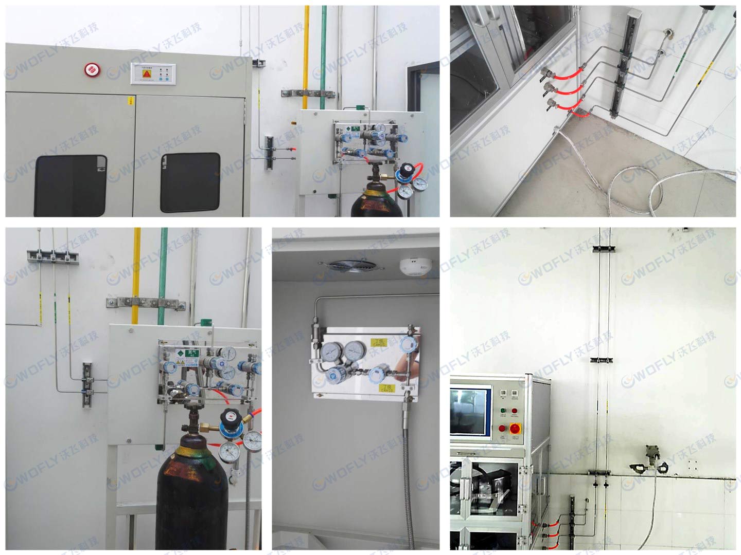 同时,按照国标要求,将所用全部气体存放于储气间,并实现集中输送,组成实验室集中供气系统。实现人气分离,保障分析测试人员在实验中免受有毒有害气体的侵害。